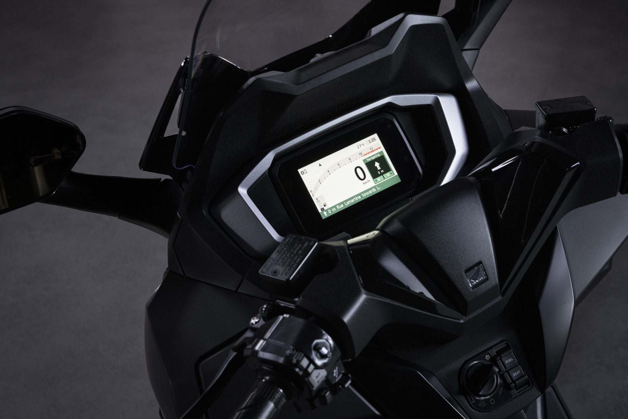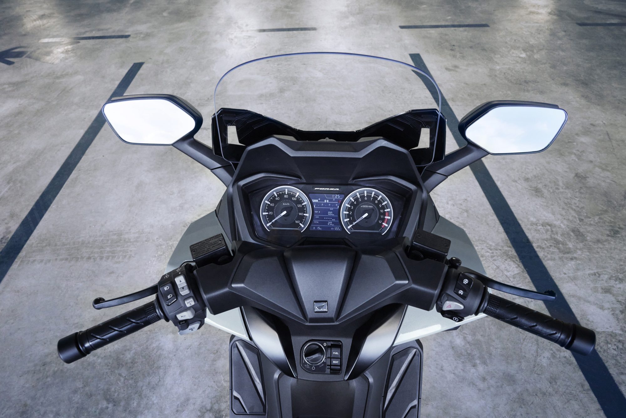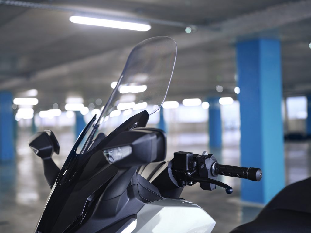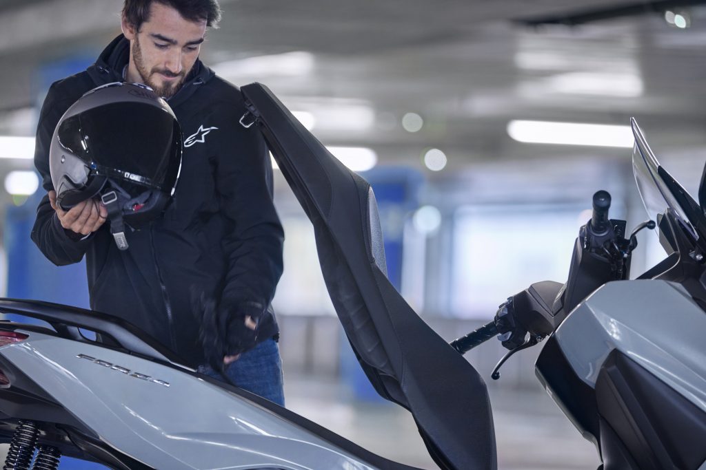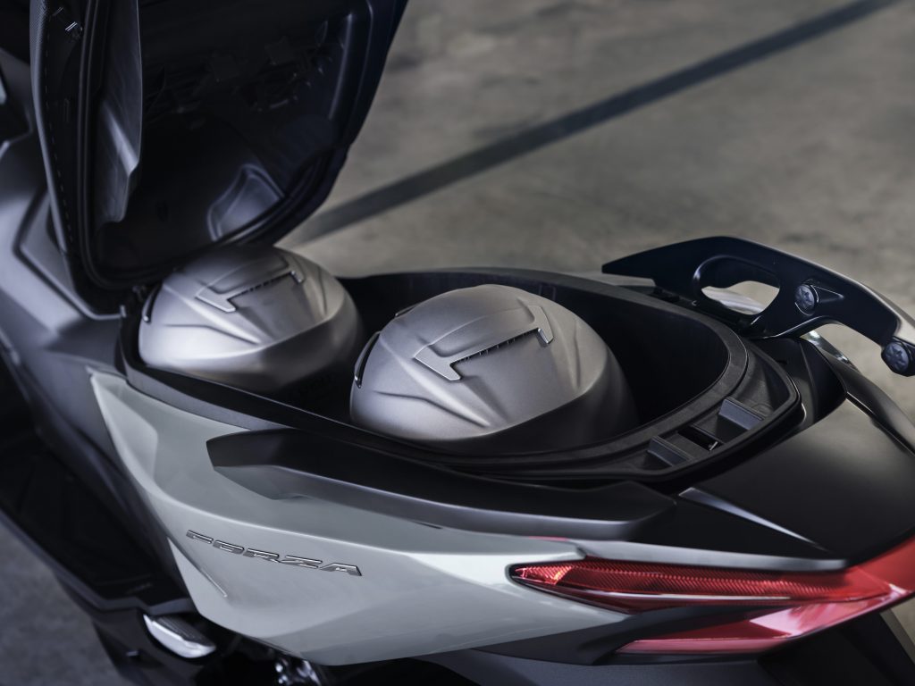 Un scuter trebuie să fie practic, nu doar atrăgător. Și aici, Forza 125 își face treaba; dispune de un spațiu imens de depozitare iluminat sub șa - suficient pentru două căști integrale. Parbrizul electric oferă protecție împotriva vântului sau o briză răcoritoare. În torpedou, pe partea stângă, vei găsi un port USB tip-C pentru a încărca un smartphone în timp ce conduci.