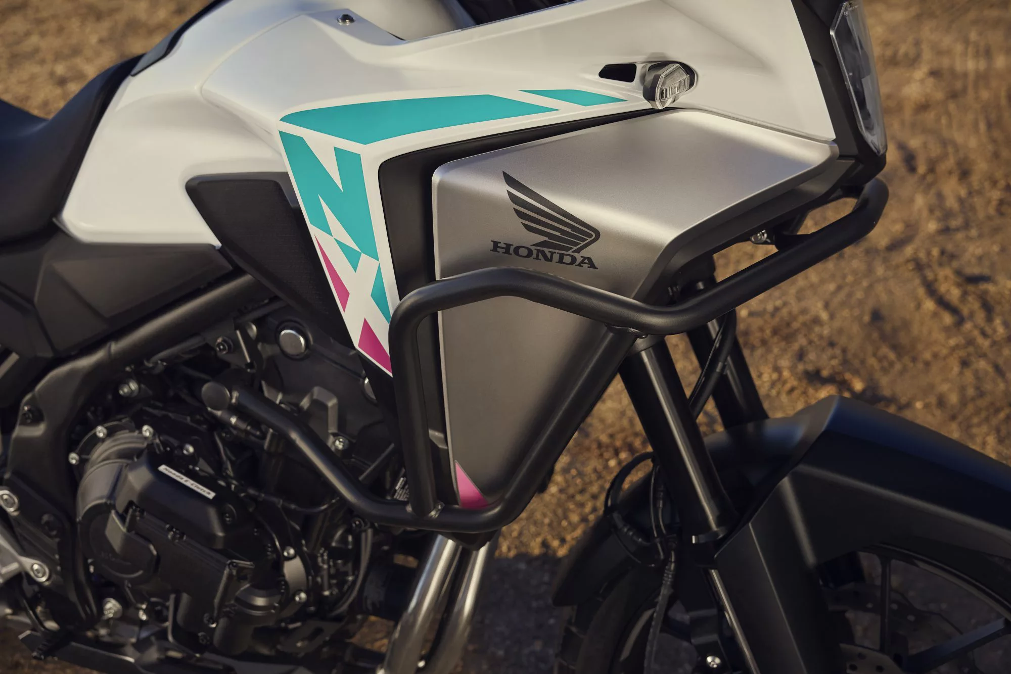Proiectat pentru a face față oricărui tip de teren, noul NX 500 este echipat cu o roată față mărită de 19", gardă la sol îmbunătățită pentru teren accidentat, cadru-diamant de oțel, ghidon cu flexibilitate mărită pentru manevrabilitate și viraje, iar componentele grele sunt grupate către centru pentru o manevrabilitate excepțională. Față de CB500X modificările nu sunt însă doar de design; cu o suită modernă de tehnologii cum ar fi, ambreiajul tip slipper-clutch, pentru tracțiune sporită chiar și la frânare, frână puternică cu două discuri față, etrieri cu 4 pistonașe montați axial și ABS cu două canale. Rezultatul este un vehicul care te poate duce oricând acolo unde vrei să ajungi.