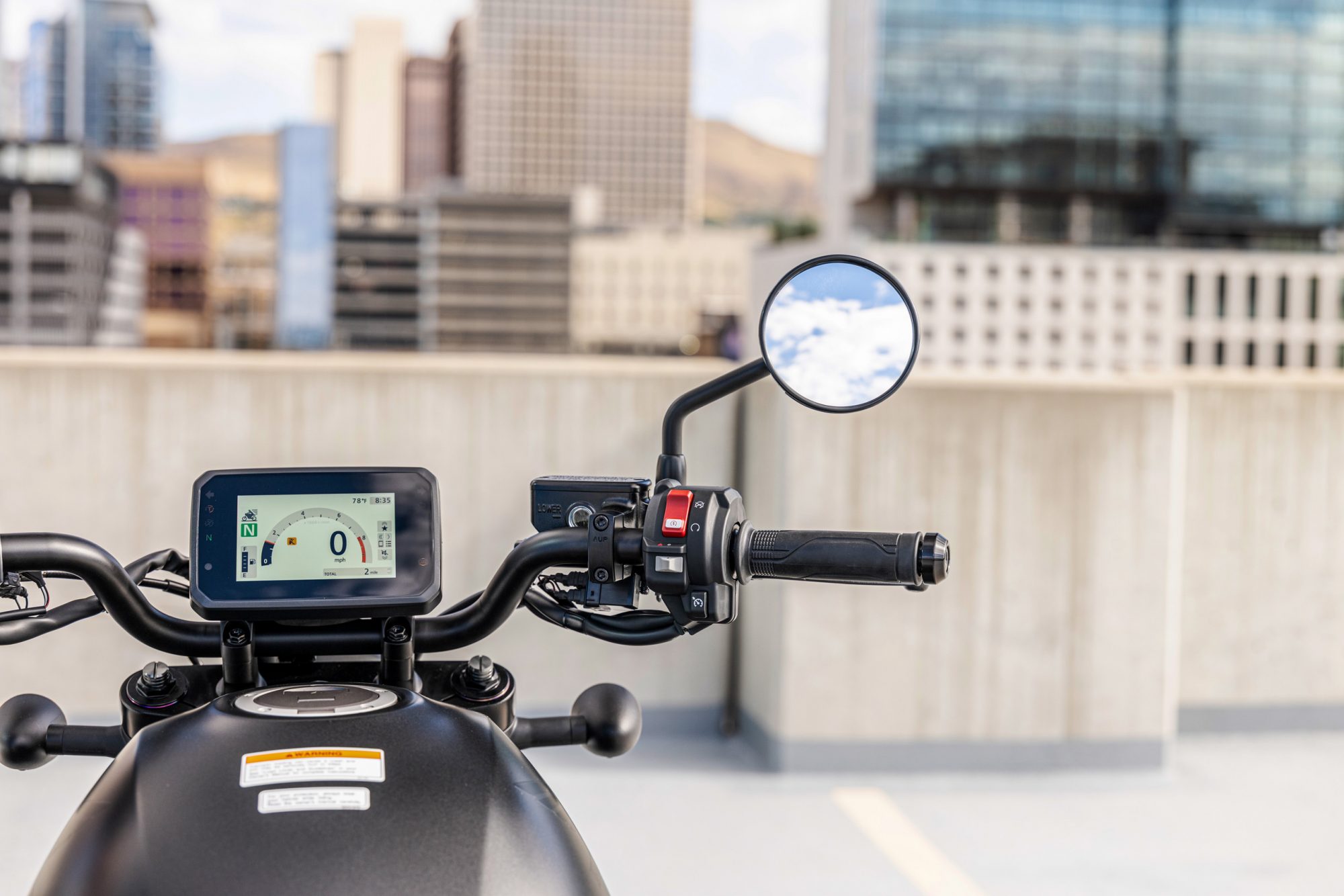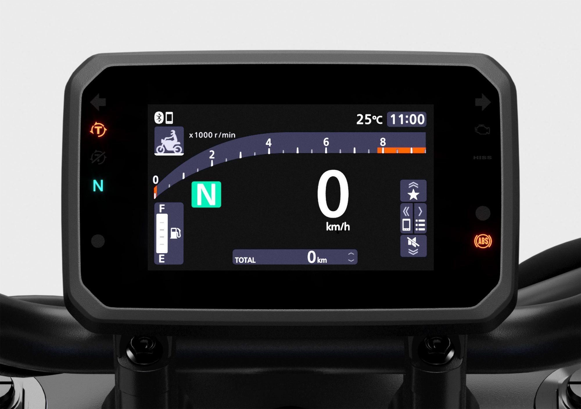 Un afișaj TFT de 5 inchi livrează intuitiv informațiille necesare, în timp ce ghidonele largi montate cu distanțiere de 1 inch oferă grip și manevrabilitate superioară.